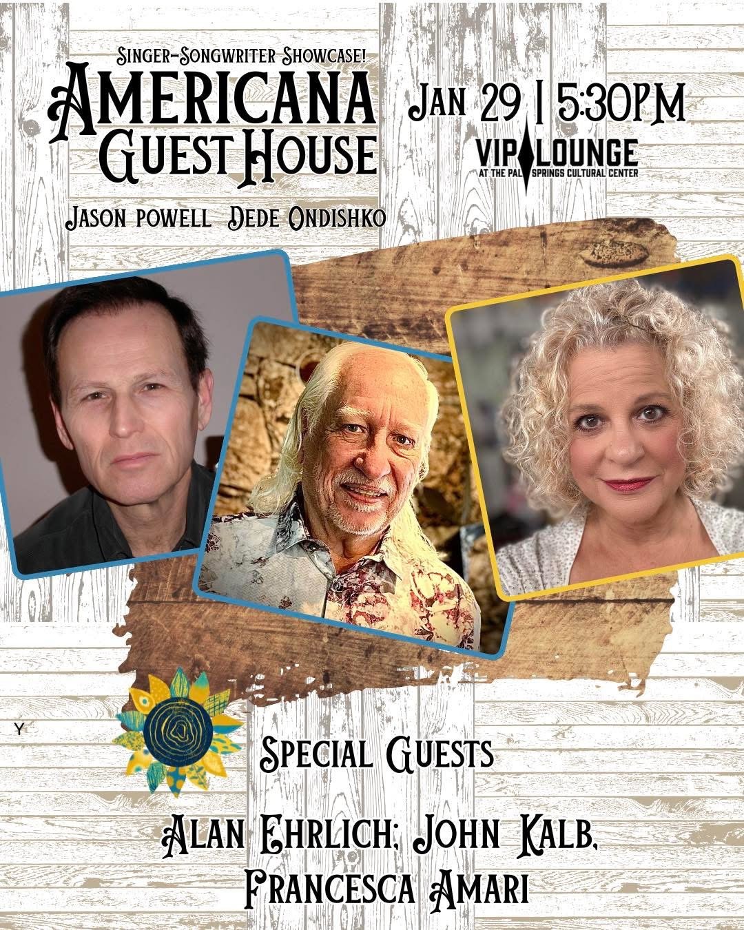Please join us for this Singer Songwriter Showcase at Americana Guest House, which will be held in the VIP Lounge of the Palm Springs Cultural Center. Special Guests include Alan Ehrlich, John Kalb, & Francesca Amari!